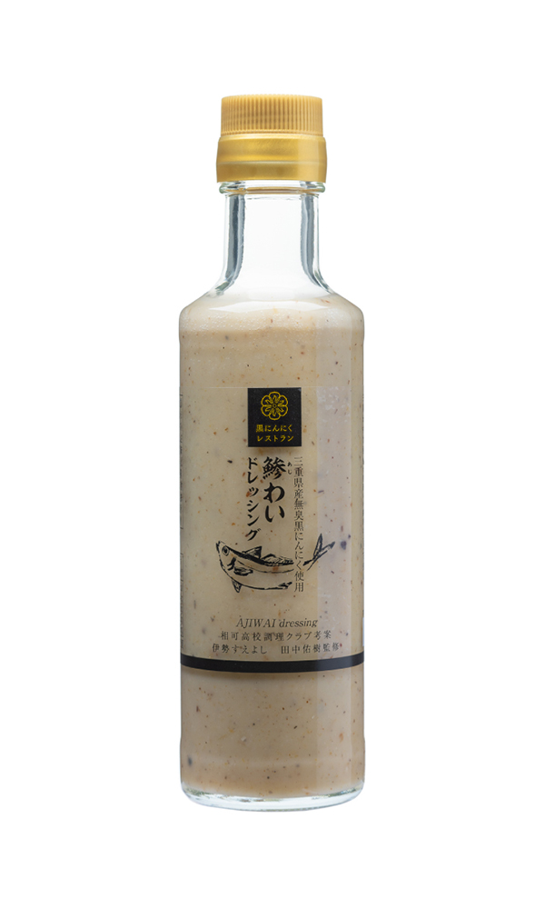 This dressing is a French-style dressing made by grinding whole Mie Prefecture-sourced aji bonito flakes into a powder and combining it with the richness and umami of Mie Prefecture-sourced odorless black garlic.